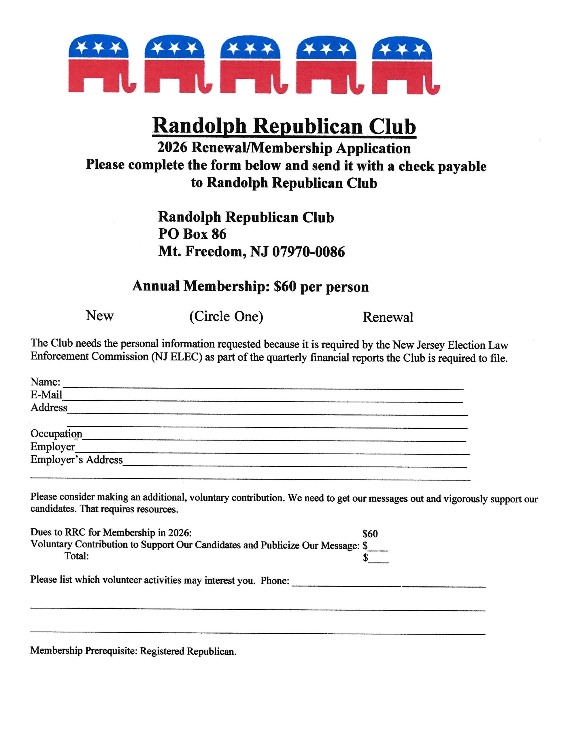 Personal inforation on the membership form is required by New Jersey Election law Enforcement Commission (NJ ELEC) as part of the quarterly financial reports the Club is required to file.